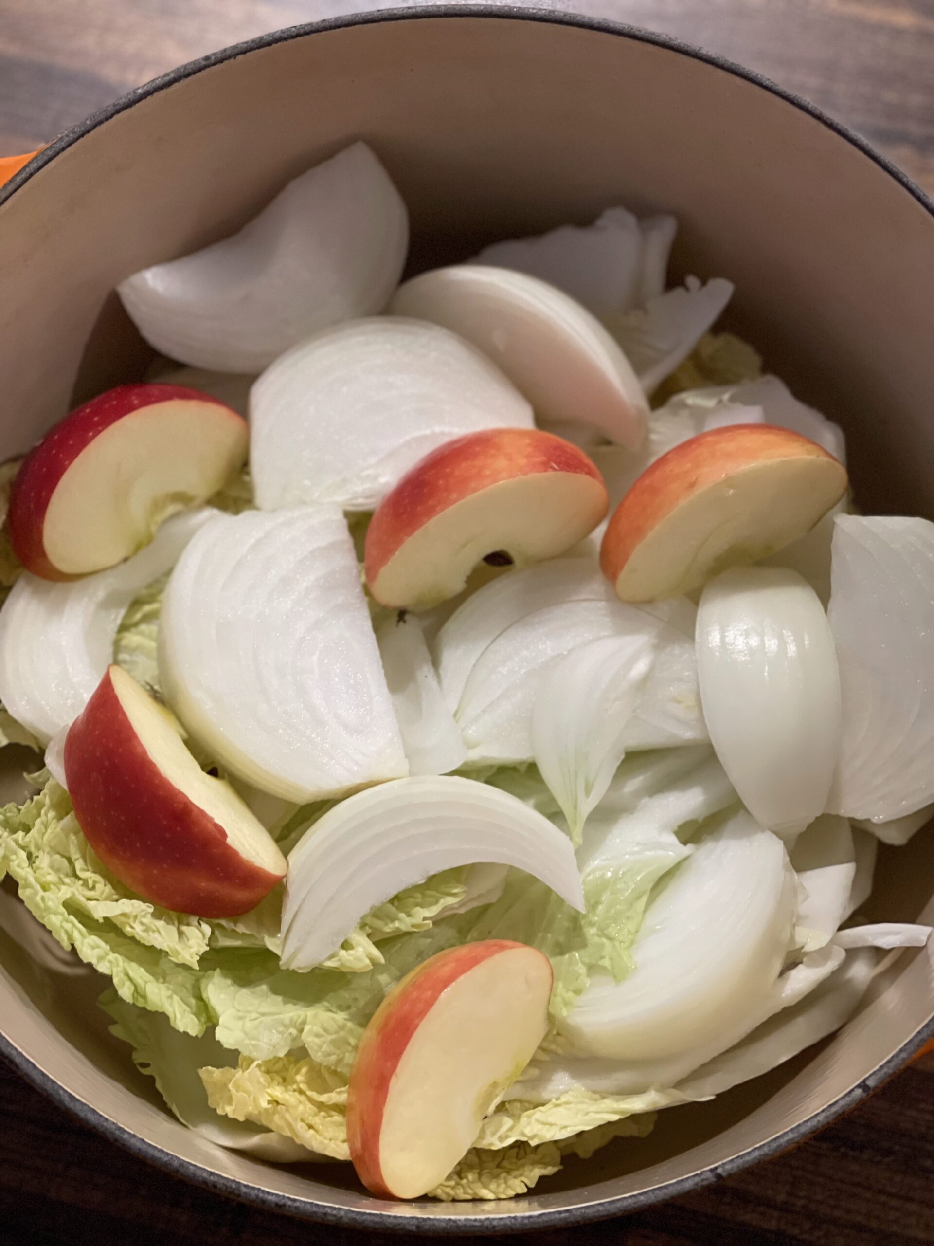 Place the quartered onion and apple chunks on top of the cabbage.