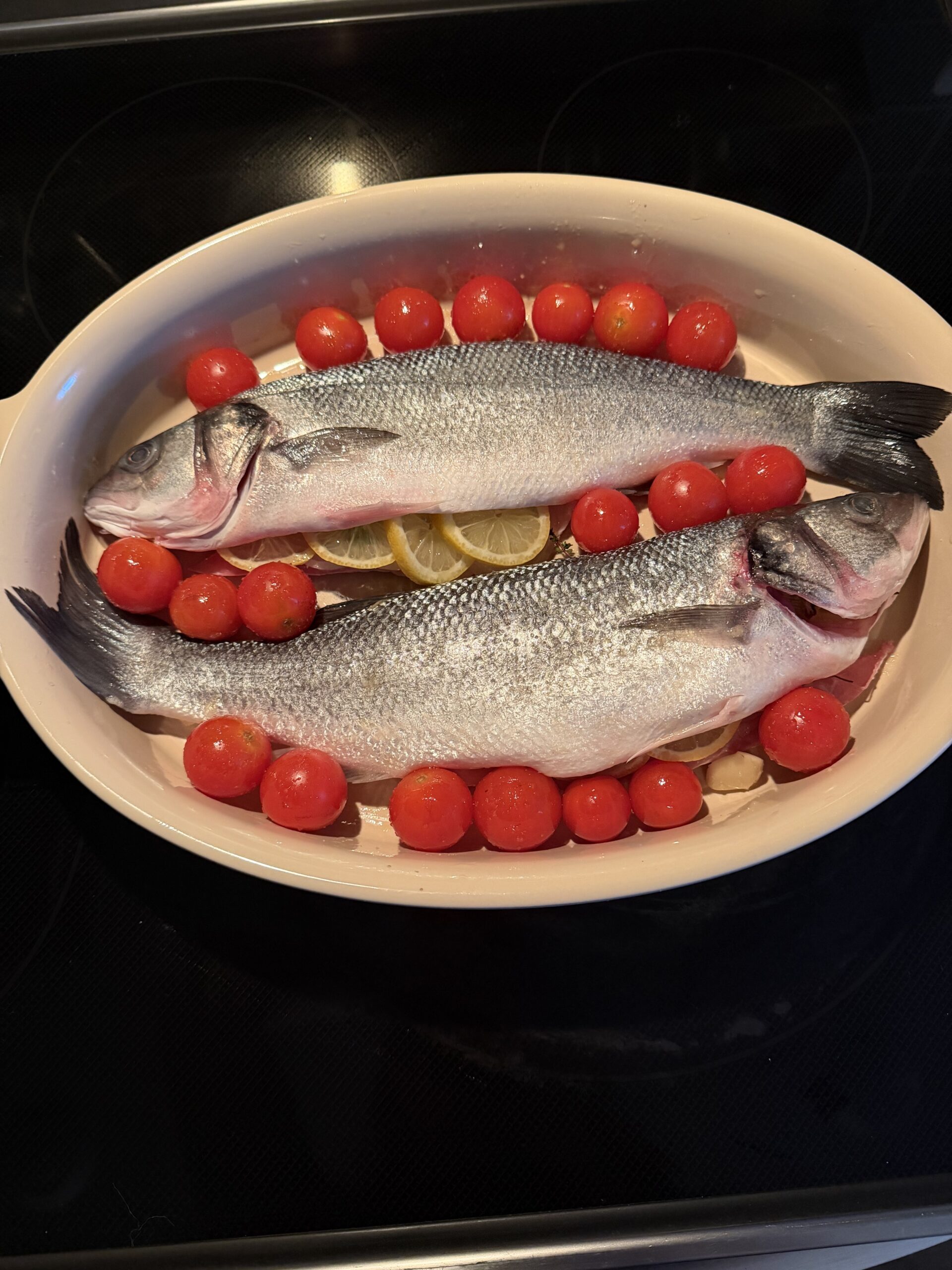 That’s why, on one of my weekly trips to Whole Foods, the gorgeous branzinos on ice instantly caught my eye. Perfectly fresh and imported from Greece, I didn’t hesitate—I picked the two biggest ones and headed straight home to roast them.