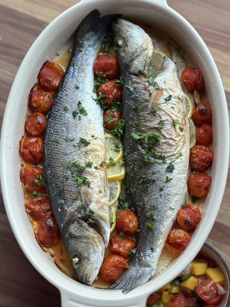 This preparation is beautifully straightforward. The fish is stuffed with lemon, shallots, and fresh herbs, then roasted alongside sweet cherry tomatoes until the skin turns lightly golden and the flesh becomes perfectly flaky. The tomatoes soften and burst in the oven, creating a bright, natural sauce that pairs perfectly with the fish.